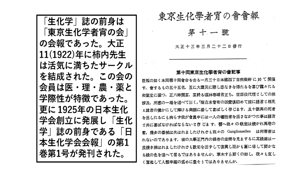 柿内先生は大正11(1922)年1月に欧文誌Journal of Biochemistryを創刊されました(創刊の経緯については別稿参照5))。同年3月に、柿内先生は活気に満ちたサークル「東京生化学者宵の会」を結成されました2, 3)。この会の会員は医・理・農・薬と学際性が特徴で、柿内先生が大正8年以降御停年まで、理学部生物化学講座を兼担されていたことが幸いしました。若い学生も教授も平等に発言して、お互いを「さん」で呼び合い論じたのです。この「東京生化学者宵の会会報」が「生化学」誌の萌芽です(図1)。この会は1925年の日本生化学会創立に発展しました2, 3, 6)。同年10月31日の本郷佛教青年会館での第一回日本生化学会総会時の会員数は368人、演題数は37でした。生化学会発足と同時に今日の「生化学」誌の前身となる「日本生化学会会報」の第1巻第1号が発刊されてから,今年で100周年を迎えます5)。初期の「日本生化学会会報」には総説欄や報告欄がありました。第二次大戦末期の被害からJournal of Biochemistryが1944年に休刊になり、それに代わる生化学の和文原著論文を掲載することとし,「日本生化学会誌」に改称されました。さらに敗戦を迎えて同誌も休刊となりました。1948年発行の第20巻から「生化学」に改称して再刊されたので、今年は100周年の年ですが「生化学」は第97巻になるのです2, 6)