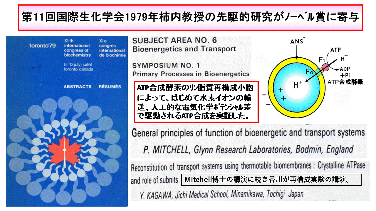 今から約1世紀も昔の柿内先生の御研究の真価は長期間を経て定着するのです5)。柿内先生の行った、膜構造を持ったミトコンドリアの呼吸が含水アセトン抽出でリン脂質を除くと停止し、リン脂質を再添加すると回復するという再構成実験7)は画期的で、その後にS. Fleisherによって世界的な標準法となりました8)。当時、酵素学に取りつかれていた世界中の研究者らが酸化的リン酸化の中間化合物の実証に失敗していました。そこでP. Mitchell博士はなぜミトコンドリアが膜構造なのかを考え、生体膜内外の電気化学ポテンシャル差が仮想のATP合成酵素にエネルギーを伝えてATPを合成するという化学浸透圧説を1961年に提唱したのです9)。その後、筆者はATP合成酵素をリン脂質小胞に組込むコール酸透析小胞再構成法に成功し、遂に化学浸透圧説を実証しました10, 11)。この成功でMitchell博士にノーベル賞が授与され、翌年の1979年のカナダでの第11回国際生化学会議のシンポジウムBioenergetics and Transportで、Mitchell博士に続き私が膜構造の再構成による膜の水素イオン輸送と中核のATP合成酵素の結晶化を報告しました(図2)10, 11)。柿内先生の先駆的研究が最も輝いた瞬間でした。自宅で実験されていたMitchell博士を自治医大客員教授にお迎えして研究を続けました(図3)。さらに第12回国際生化学会議では膜電位でATP合成を証明して新学説を決定的なものとしたのです11)ATP合成酵素のFoとよばれる膜内部分は水素イオンが電気化学ポテンシャル差で駆動されるエネルギーで回転するモーターであり、そのエネルギーがATP合成酵素の高次構造の変化のエネルギーとなって、ADP+PiからATPを合成するという機序が確立しました(図4)12)。その功績でノーベル賞を得たJ. Walker博士と筆者の共論文も「生化学」を通して国内に広く伝えられました。