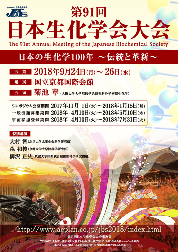 日本生化学会誕生100周年ならびに「生化学」誌創刊100周年をお祝い申し上げます。私は1985年に入会以来、米国での研究期間3年を除けば、ほぼ毎年生化学会大会に参加し、演題を発表し、討論し、研究仲間を作ることにより、研究者として育てていただいたので、生化学会に対する思い入れは人一倍強いつもりである。また、雑誌「生化学」は優れた総説を和文で読めるという貴重な紙媒体であり、今でも2か月に1回届く本誌を楽しみにしている。さて、私は2018年9月24日~26日の3日間、京都国際会議場で開催された第91回日本生化学会大会の会頭を務めさせていただいた。今回、「艦往知来~生化学会100年の軌跡」に執筆の機会をいただいたので、その当時の記憶を呼び戻しながら、第91回大会を振り返ってみたい。