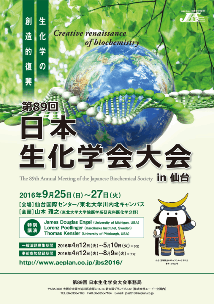 東日本大震災から5年という節目の年である2016年の9月25日より3日間、仙台で第89回日本生化学会大会を開催した。菊地吾郎先生が1981年に第54回大会を仙台で開催したときには、博士課程大学院生として、発表と準備・運営の両面で参加したが、それ以来、35年ぶりに私たち東北大学大学院医学系研究科の医化学分野が生化学会大会を主催することになり、昨今の学会運営事情の変化などに新鮮な驚きを感じながら、準備をした。また、仙台での開催も1995年の水野重樹会頭による第68回大会以来21年ぶりだったので、地方開催の魅力が感じられるような、手作り感のある大会運営を目指した。なお、同年4月14日に熊本地震が発生したため、被災地からの大会参加者を支援する取り組みも行った。