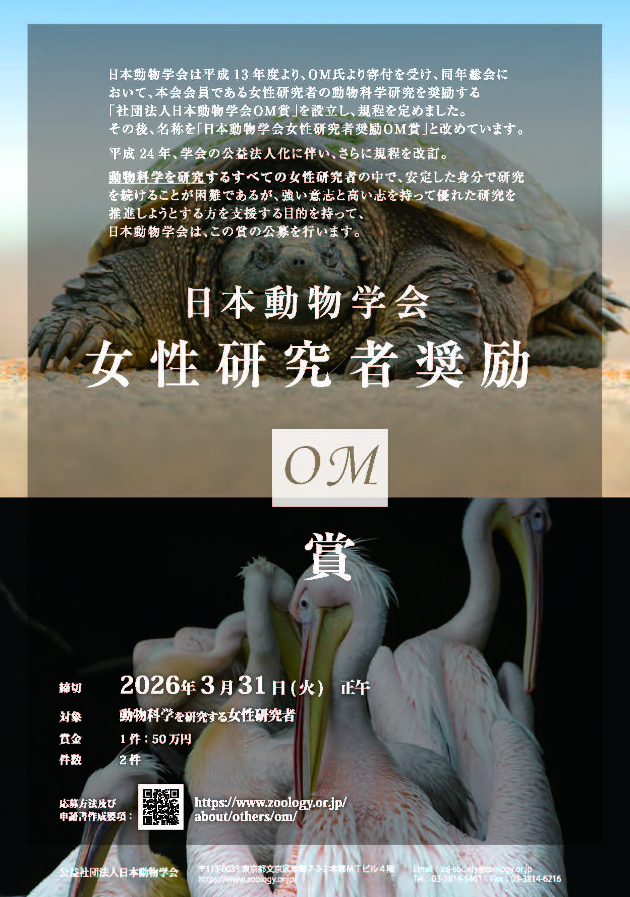 2026年度 日本動物学会女性研究者奨励OM賞、動物学教育賞、茗原眞路子研究奨励助成金 (公社)日本動物学会